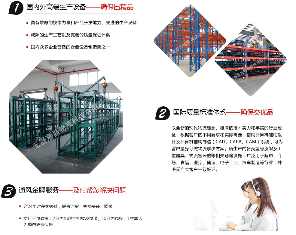 無錫嘉昌倉儲貨架有限公司是國內(nèi)現(xiàn)代倉儲物流技術(shù)開發(fā)、設(shè)計(jì)、生產(chǎn)和安裝的專業(yè)廠家,具有雄厚的技術(shù)力量和產(chǎn)品開發(fā)能力、先進(jìn)的生產(chǎn)設(shè)備、成熟的生產(chǎn)工藝以及完善的質(zhì)量保證體系。公司始終“以質(zhì)量求生存,以信譽(yù)求發(fā)展的”的經(jīng)營理念,放眼世界,積極引進(jìn)、吸收國際物流行業(yè)先進(jìn)技術(shù),憑借專業(yè)的制作經(jīng)驗(yàn)、優(yōu)秀的產(chǎn)品質(zhì)量,是國內(nèi)眾多企業(yè)首選的倉儲設(shè)備制造商之一。